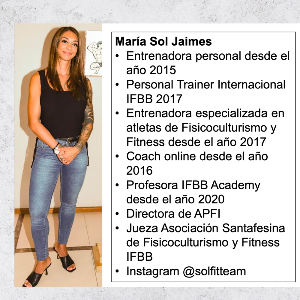 Este curso teórico-práctico fue desarrollado por María Sol Jaimes, entrenadora certificada, docente de la IFBB Academy y referente en recomposición corporal en adultos. Forma parte del programa oficial de capacitación de la IFBB Argentina y está orientado a profesionales del entrenamiento, kinesiólogos, personal trainers y estudiantes avanzados de ciencias del movimiento.